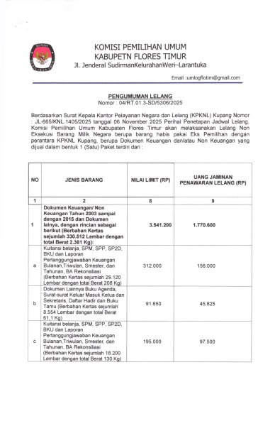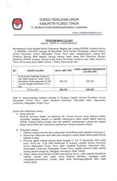 Pengumuman Nomor : 03/RT.01 .3-SD/530612025 Perihal Penetapan Jadwal Lelang, Komisi Pemilihan Umum Kabupaten Flores Timur akan melaksanakan Lelang Non Eksekusi Barang Milik Negara berupa barang habis pakai Eks Pemilihan dengan perantara KPKNL Kupang, berupa Surat Suara Pemilihan Gubernur dan Wakil Gubernur Tahun 2018 yang dijual dalam bentuk 1 (Satu) Paket.