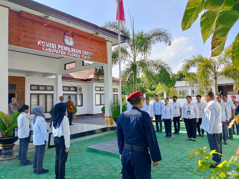 Dihalaman kantor Komisi Pemilihan Umum Kabupaten Flores Timur dilaksanakan Apel Pagi yang dipimpin oleh Sekretaris KPU Kabupaten Flores Timur, Jermia Elia David Luase dan didampingi Ketua KPU Kabupaten Flores Timur, Antonius Djentera Betan dan Kadiv Teknis, Arifin Atanggae.