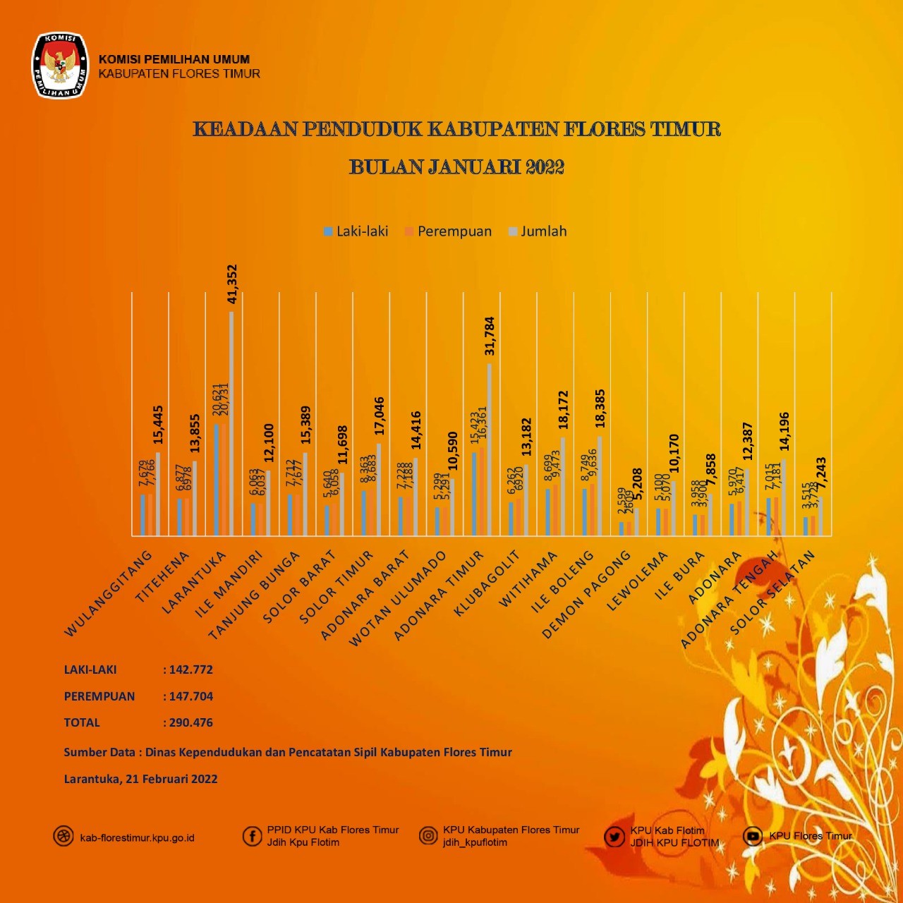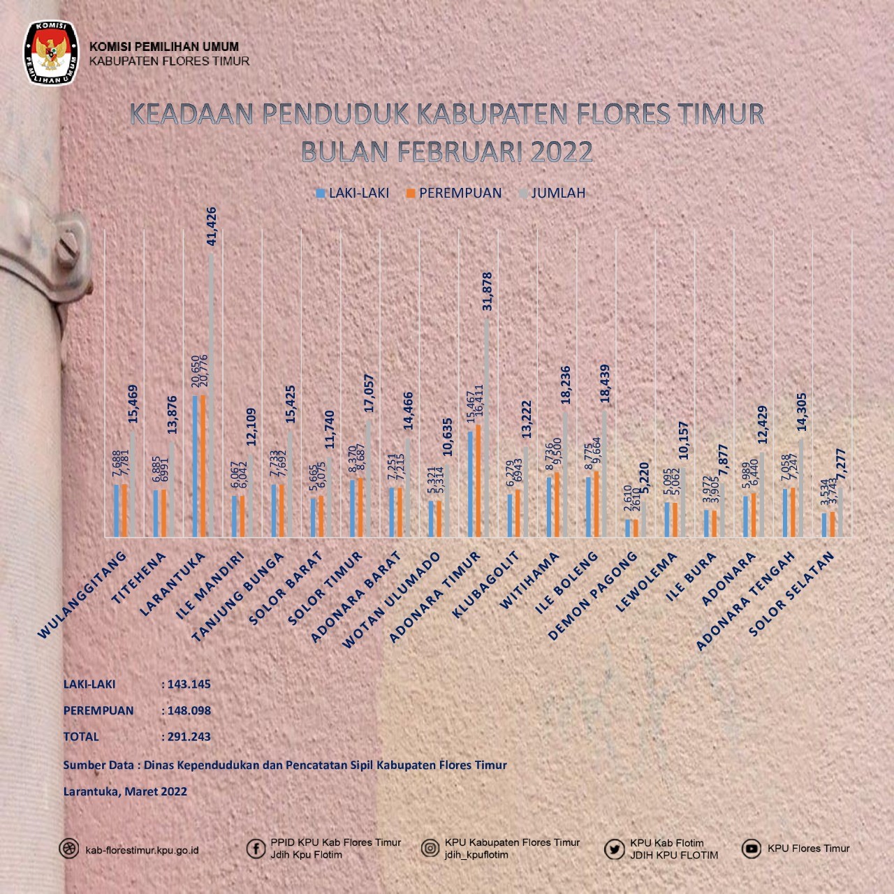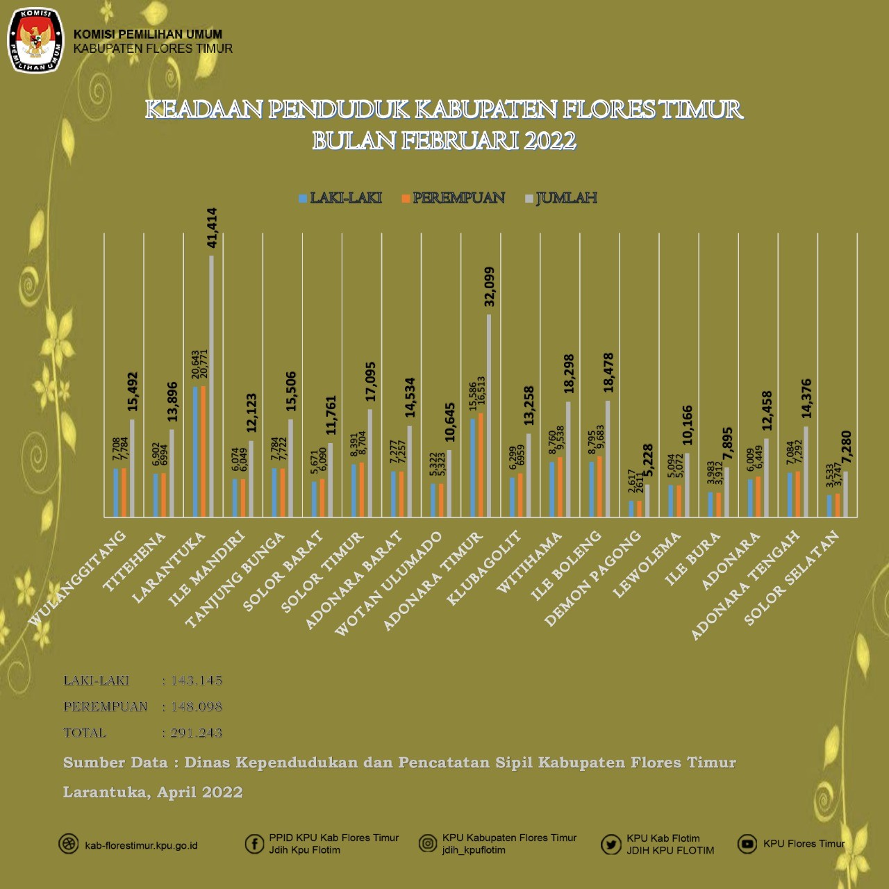 KPU Flotim sebagai entitas yang berwenang membentuk/mengelola Dapil, melakukan monitoring terhadap jumlah penduduk Kabupaten Flores Timur dengan berkoordinasi ke Dinas Kependudukan dan Pencatatan Sipil Kab. Flores Timur. Hasil koordinasi tersebut, diperoleh salinan jumlah penduduk Kabupaten Flores Timur setiap bulannya yang kemudian dikemas dalam infografis sebagai berikut: