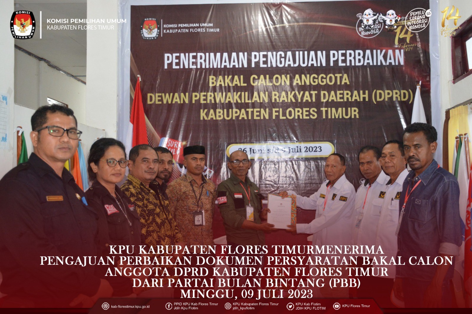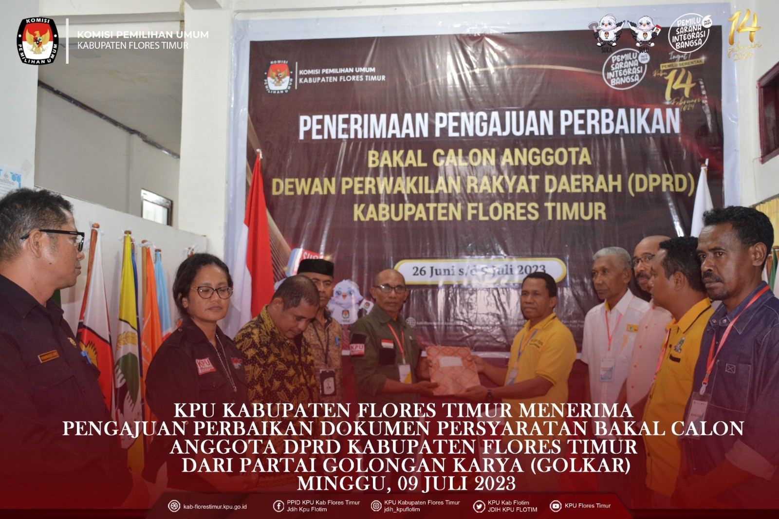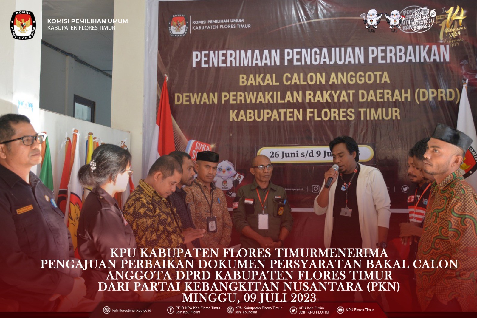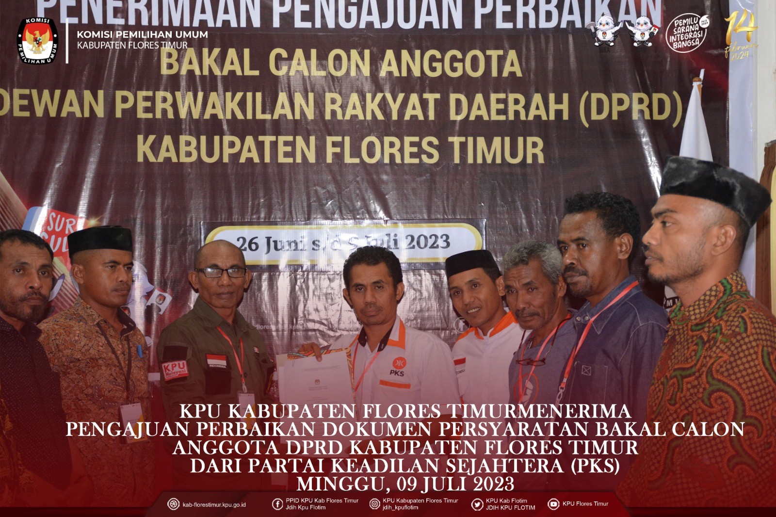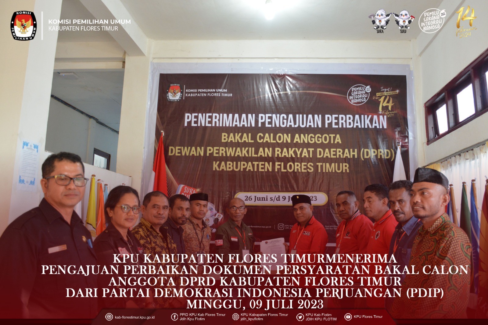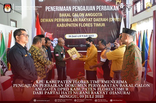 https://kab-florestimur.kpu.go.id/. #TemanPemilih KPU Kabupaten Flores Timur menerima Pengajuan Perbaikan Dokumen Persyaratan Bakal Calon Anggota DPRD Kabupaten Flores Timur untuk Pemilu Tahun 2024 dari Partai Demokrasi Indonesia Perjuangan Flores Timur Minggu, (9/7/2023) di Kantor KPU Kabupaten Flores Timur. Rombongan Partai Demokrasi Indonesia Perjuangan melakukan registrasi pada pukul 16.24 wita selanjutnya diterima oleh Ketua KPU Kabupaten Flores Timur Kornelius Abon didampingi Anggota KPU Kabupaten Flores Timur Gergorius Sule Sanga, Fabianus Boli Uran, Tirza Marselina Claudiana dan Sekretaris KPU Kabupaten Flores Timur Kondradus Liwu serta disaksikan oleh Ketua Bawaslu Kabupaten Flores Timur Arifin Atanggae dan Anggota Karolus Riang Tukan. Pengajuan Perbaikan Dokumen Persyaratan Bakal Calon Anggota DPRD Kabupaten Flores Timur diserahkan oleh Ketua Partai Keadilan Sejahtra Kabupaten Flores Timur Antonius H. Gege Hadjon didampingi Sekretaris Robertus Rebon Kereta, Bendahara Konrardus Kusno Wada, dan Maria B. Betan Penghubung partai sekaligus admin. Dokumen diperiksa oleh Tim Pemeriksa didampingi Admin Partai Demokrasi Indonesia Perjuangan dan diawasi langsung oleh Bawaslu Kabupaten Flores Timur. Dari hasil pemeriksaan dokumen dinyatakan lengkap dan diterima untuk 30 (tiga puluh) Bakal Calon dari 7 (tujuh) Daerah Pemilihan di Kabupaten Flores Timur. Saat penyerahan berita acara penerimaan pengajuan perbaikan bakal calon, Ketua KPU Kabupaten Flores Timur Kornelius Abon menegaskan bahwa berkas perbaikan masih harus diperiksa lagi, apakah hasil akhir nanti Memenuhi Syarat atau Tidak Memenuhi Syarat. Partai Demokrasi Indonesia Perjuangan merupakan Partai Peserta Pemilihan Umum Tahun 2024 Tingkat Kabupaten Flores Timur, yang ke sembilan menyerahkan Perbaikan Dokumen Persyaratan Bakal Calon ke KPU Kabupaten Flores Timur. #Sukseskanpemiluserentak2024