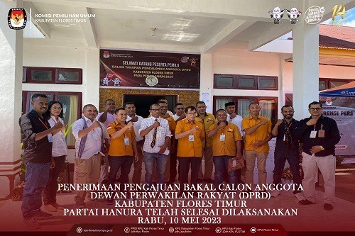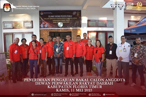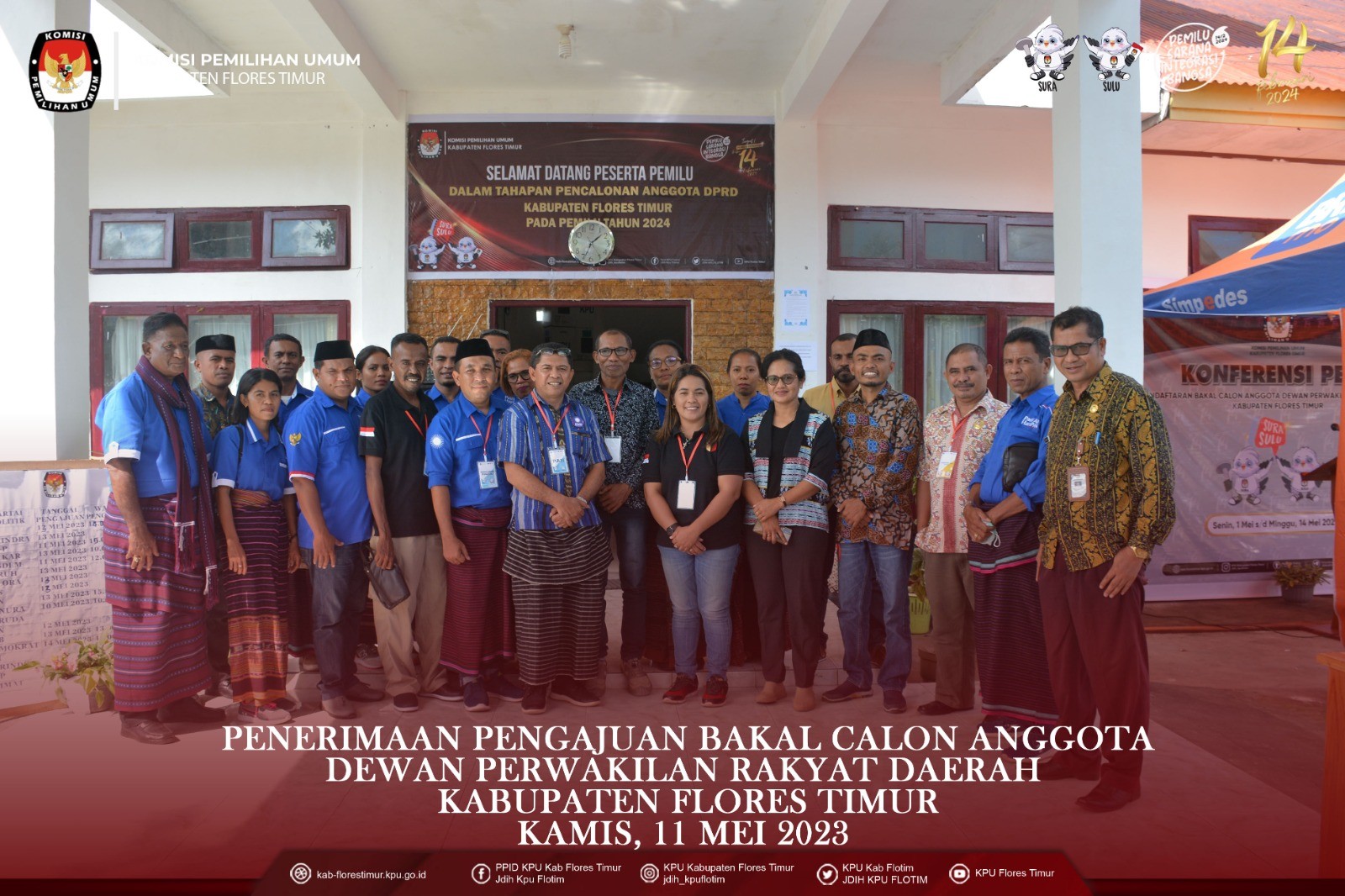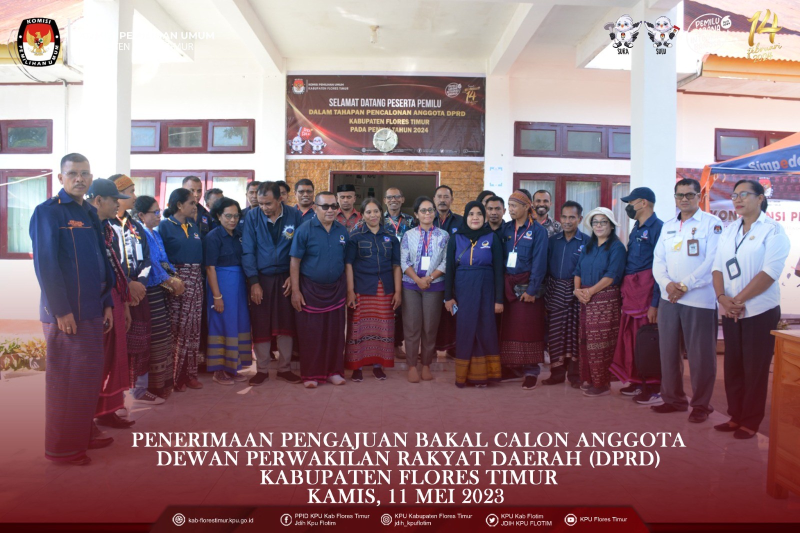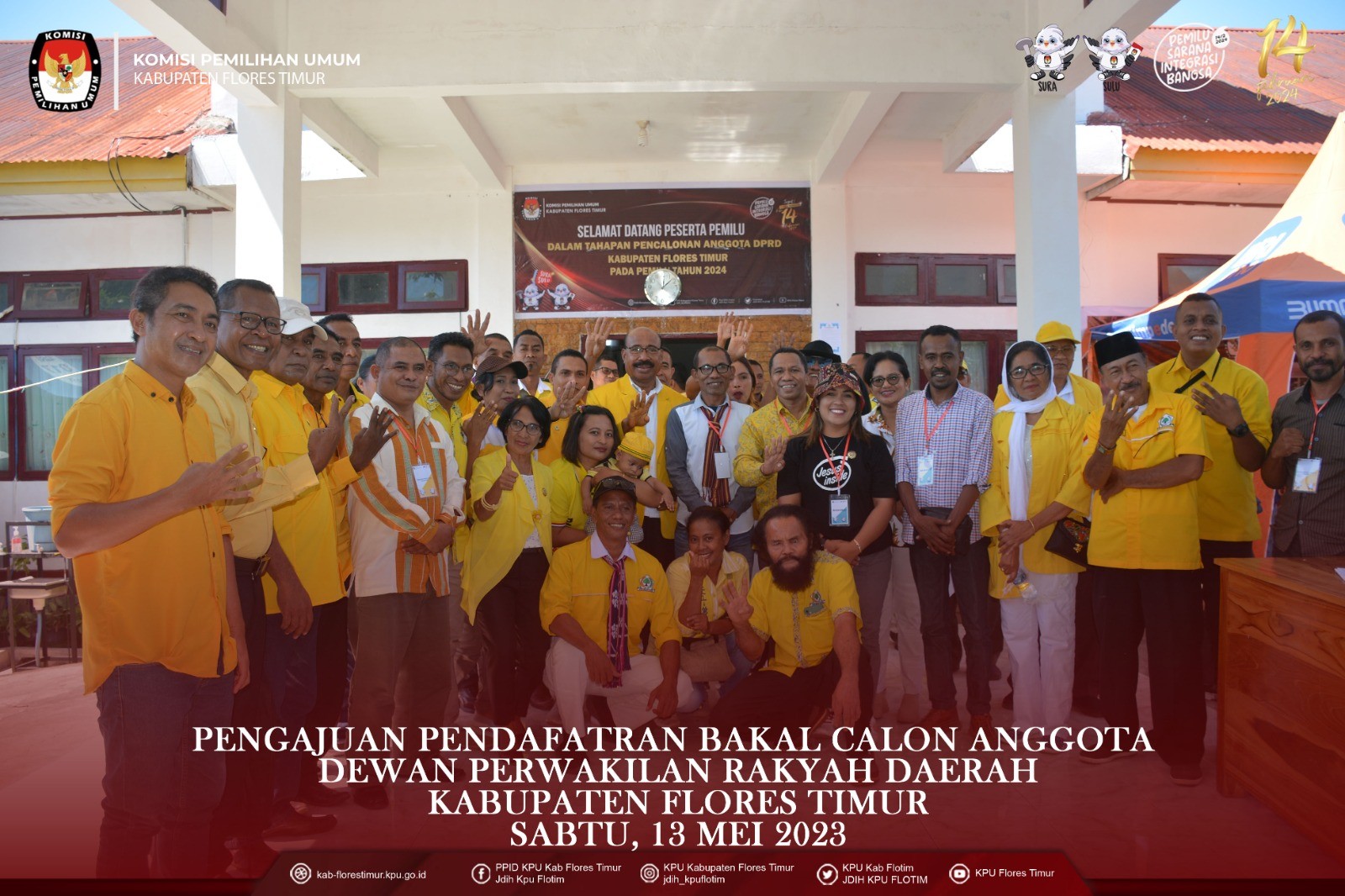 https://kab-florestimur.kpu.go.id/. Larantuka - Sabtu, 13 Mei 2023, H – 2 waktu Pengajuan Pendaftaran Bakal Calon Anggota DPRD kabupaten Flores Timur, terdapat sejumlah partai yang berbondong-bondong ke Kantor KPU kabupaten Flores Timur. Pada pukul 10:22 Wita Partai Golongan Karya (GOLKAR)mendatangi kantor KPU untuk mendaftar yang terdiri Ketua Yoseph Sani Betan, ST. didampingi oleh Sekretaris IR. Damianus Rianghepat, beserta rombongan. Berbekal dokumen pendaftaran bakal calon anggota legislatif berjumlah 30 bakal calon melangkah dengan pasti memasuki Kantor KPU Kabupaten Flores Timur. Ketua KPU Kornelius Abon, beserta jajarannya, dan Sekretaris KPU kondradus Liwu, beserta Jajarannya menyambut kedatangan rombongan Partai GOLKAR di pelataran kantor KPU dengan rangkaian serimonial penyambutan sebagai mana mestinya. Kornelius Abon membuka Rangkaian serimonial penjemputan. Dalam sambutan kornelius menjelaskan, mekanisme pengecekan dokumen pengajuan bakal calon akan di lakukan oleh tim pemeriksa yang berada di lantai dua gedung KPU Flotim. Yang dapat mendampingi selama proses pemeriksaan dari perwakilan partai hanyalah penghubung dan admin silon dari partai politik, selebihnya dapat menunggu di tempat yang telah kami sediakan guna kelancaran selama masa pemeriksaan. Tutur Abon Usai dilakukan pemeriksaan akan ada tahap penandatangan berita acara, dan tanda terima hasil generet dari aplikasi silon, tutur Kornelius. Ketua GOLKAR Yoseph Sani Betan, ST, yang berkesempatan sambutan mengatakan, diamana sebagai salah satu peserta pemilu dan tentu jugai penyelenggara kita patut mengucapkan kata syukur Kepada Tuhan Yang Maha Kuasa, semoga semuanya berjalan dengan baik meskipun proses masih panjang. Adanya penyesuaian waktu yang awalnya di jadwalkan pada tanggal 12 Mei dengan koordinasi yang dibangun bersama KPU di jadwalkan kembali pada tanggal 13 Mei 2023. Dalam konsolidasi ke KPU GOLKAR terekam paling banyak.hal ini tentu sebagai bagian dari solidaritas, menjaga konsistensi kerja dalam pengajuan bakal calon agar tetap berpedoman pada PKPU Nomor 10 Tahun 2023, dan Aturan KPU yang berlaku, urai Yoseph. Proses penyerahan dokumen bakal calon selesai dilakukan pemeriksaan selama 35 menit dengan hasil pemeriksaan lengkap dan benar. Selanjutnya Penandatanganan berita acara dan tanda terima yang dilakukan oleh Ketua KPU Kabupaten Flores Timur Kornelius Abon, Anggota Gergorius Sule Sanga, Ibrahim Ja’far, Tirza Marselina Claudiana, dan Fabianus Boli Uran, serta penandatangan tanda terima oleh tim pemeriksaan dan Penghubung Partai Politik maka semua proses pemeriksaan dinyatakan selesai hingga ditandai dengan penyerahan dokumen hasil pemeriksaan oleh Ketua KPU ke Ketua Partai GOLKAR