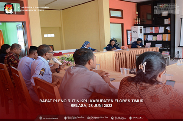 kab-florestimur.kpu.go.id. Larantuka_(28/06/2022) Komisi Pemilihan Umum Kabupaten Flores Timur menggelar Rapat Pleno Rutin di Lantai 2 gedung kantor KPU Flotim. Rapat Pleno tersebut sebagai bagian dari pelaksanaan Pasal 63 ayat (4) Peraturan Komisi Pemilihan Umum Republik Indonesia Nomor 8 Tahun 2019 tentang Tata Kerja Komisi Pemilihan Umum, Komisi Pemilihan Umum Provinsi, dan Komisi Pemilihan Umum Kabupaten/Kota, yang menyatakan bahwa ”Rapat Pleno Rutin dilaksanakan paling sedikit 1 (satu) kali dalam seminggu. Rapat pleno yang dipimpin oleh Ketua KPU Kabupaten Flores Timur, Kornelius Abon, SE, mengagendakan beberapa kegiatan diantaranya Hasil Opname Fisik BMN, Surat Keptusan 191 tentang Sertifikat elektronik KPU, Proses Penginputan Data oleh Parpol melalui SIPOL, Surat Edaran Nomor 5 Tahun 2022 serta beberapa agenda rutin lainnya. Salah satu agenda yang jadi agenda utama dibahas dalam Pleno Rutin kali ini yaitu Terkait Tindak Lanjut Surat Edaran Nomor 5 Tahun 2022 tentang Sistim Kerja Pegawai di Lingkungan Sekretariat Jenderal KPU, Sekretariat KPU Provinsi/Komisi Independen Pemilihan Aceh dan Sekretariat KPU/Komisi Independen Pemilihan Kabupaten/Kota pada Masa Tahapan Pemilu dan Pemilihan Serentak Tahun 2024, dimana KPU Kabupaten Flores Timur telah melaksanakan Piket 24 Jam sesuai Arahan SE dimaksud. Turut hadir dalam rapat pleno rutin tersebut Bapak/Ibu komisoner, Plh.Sekretaris, Para Kasubag, Staf ASN sebagai Notula dan beberapa Staf pelakasana sekretariat KPU Kabupaten Flores Timur. _Proda