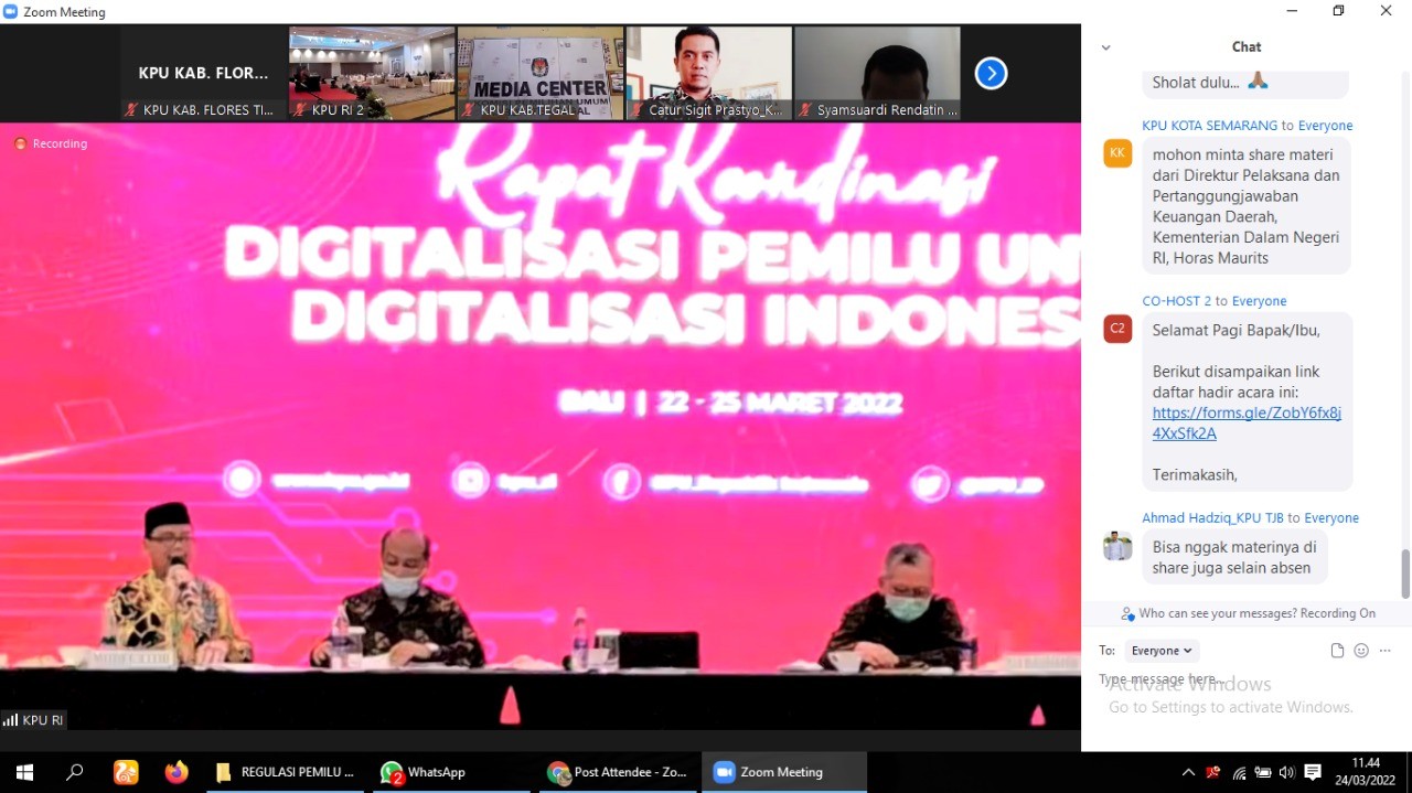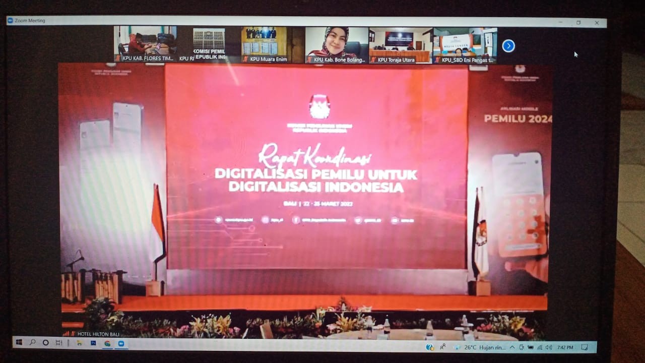 Larantuka - Persiapan Penyelenggaraan Pemilihan Serentak Tahun 2024 Pada Rapat Koordinasi Digitalisasi Pemilu Untuk Indonesia Yang Diselenggarakan Oleh KPU RI secara virtual yang telah dilangsungkan dari hari selasa 22 maret 2024 sampai pada hari ini kamis 24 maret 2022, ketua kpu flotim beserta anggota dan sekretaris beserta kasubag dan staf turut ambil andil dalam kegiatan Rapat Koordinasi Digitalisasi Pemilu dari ruang kerja masing-masing, kami (24/03/2022). Dalam pemaparan materi di hari ke tiga oleh Dr. Drs. A. Fatoni, M.Si menjelaskan bahwa Persiapan Penyelenggaraan Pemilihan Serentak Tahun 2024 Pada Rapat Koordinasi Digitalisasi Pemilu Untuk Indonesia Yang Diselenggarakan Oleh KPU RI dan Dana penyelenggaraan dan pengawasan Pemilu wajib dianggarkan dalam APBN di ataur dalam UU 7 TAHUN 2017 Kementrian Dalam Negeri serta Dukungan pemerintah daerah dalam pelaksanaan pemilu serentak berdasarkan Pasal 434 ayat (1) dan (2) UU No 7 Tahun 2017 tentang Untuk kelancaran pelaksanaan tugas, wewenang, dan kewajiban Penyelenggara Pemilu, Pemerintah dan pemerintah daerah wajib memberikan bantuan dan fasilitas sesuai dengan ketentuan peraturan perundang-undangan, tuturnya. Lanjut Digitalisasi yang mewarnai kehidupan bangsa saat ini harus diadopsi sebagai pilar pengelolaan keuangan daerah. Setiap tahapan pengelolaan harus beradaptasi dengan proses digital dengan tujuan menghasilkan proses yang lebih efisien dan efektif. Dengan tetap memperhatikan prinsip cost-benefit, proses digitalisasi diterapkan melalui pengembangan SIPD di semua tahapan pengelolaan keuangan daerah, lanjut A. Fatoni.