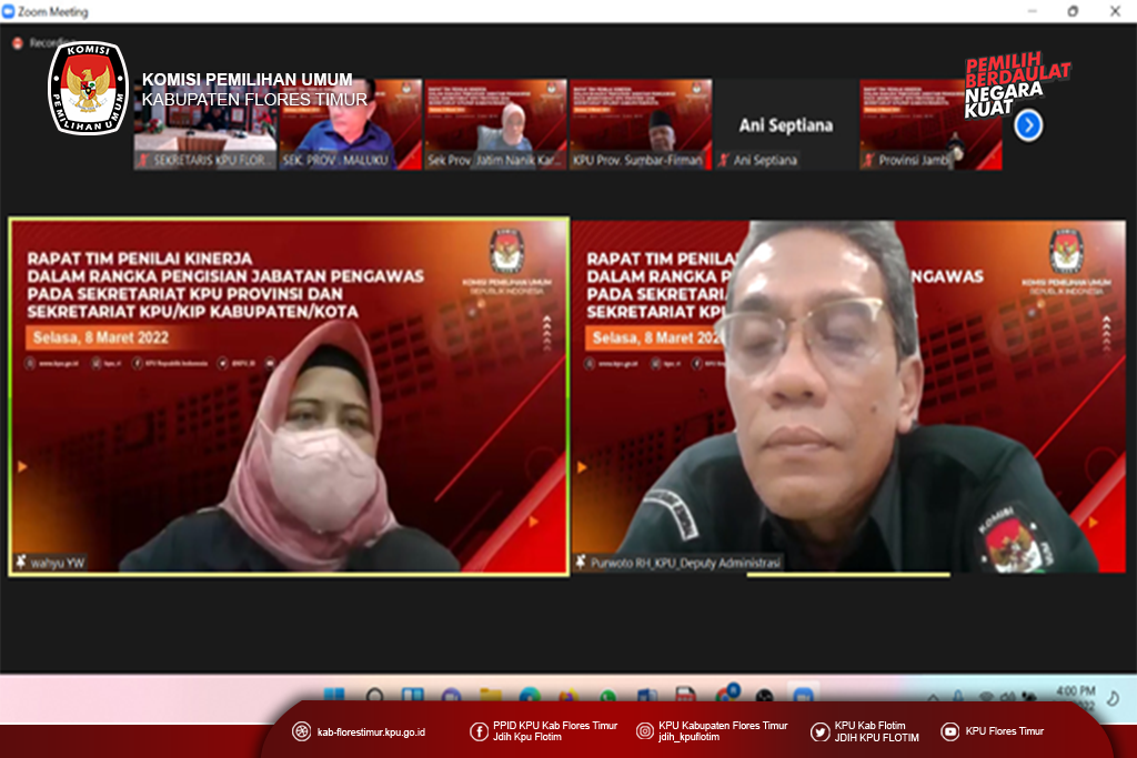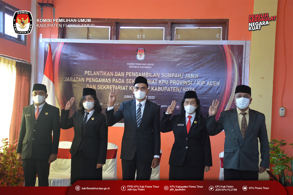 kab-florestimur.kpu.go.id. Larantuka – pada hari Jumat 11 Maret bertempat di lantai dua kantor KPU Kabupaten Flores Timur telah dilaksanakan pelantikan pejabat pengawas dan pengambilan sumpah/janji pejabat pengawas pada sekretariat KPU Provinsi/KIP Aceh dan Sekretariat KPU Kabupaten/Kota, yang dihadiri oleh Ketua dan Anggota, Sekretaris, serta para Staf KPU Kabupaten Flores Timur, jumat (11/03/2022). Sekretaris Provinsi NTT Bapak Kusmanto Riwu Djo Naga melantik dan mengambil sumpah pejabat pengawas lingkup Sekretariat KPU Kabupaten/Kota Seprovinsi Nusa Tenggara Timur berdasarkan keputusan Sekretaris Jenderal KPU RI no 248 tahun 2022 tanggal 09 maret 2022, pejabat pengawas KPU Kabupaten Flores Timur yang dilantik adalah Abdurrahman, Mikhael Lamabelawa, Rossa Asry, Roynald Halan, dan Theresia Ose Bolen, secara daring. Pada pengambilan sumpah/janji pejabat pengawas Bapak Abdurrahman dengan jabatan Kepala Sub Bagian Teknis dan Partisipasi Masyarakat pada KPU Kota Kupang, Mikhael Lamabelawa dengan jabatan Kepala Sub Bagian Teknis dan Partisipasi Masyarakat pada KPU Kabupaten Flores Timur, Rossa Asry dengan jabatan Kepala Sub Bagian Hukum dan SDM pada KPU Kabupaten Flores Timur, Roynald Halan dengan jabatan Kepala Sub Bagian Perencanaan Data dan Informasi pada KPU Kabupaten Rote Ndao, dan Theresia Ose Bolen dengan jabatan Kepala Sub Bagian Keuangan, Umum dan Logistik pada KPU Kabupaten Flores Timur, dan kedatangan Ibu Dian Syahdan Sina Gula dengan jabatan Kepala Sub Bagian Perencanaan Data dan Informasi pada KPU Kabupaten Flores Timur, secara daring.