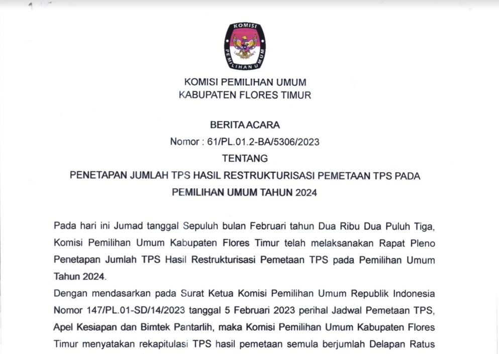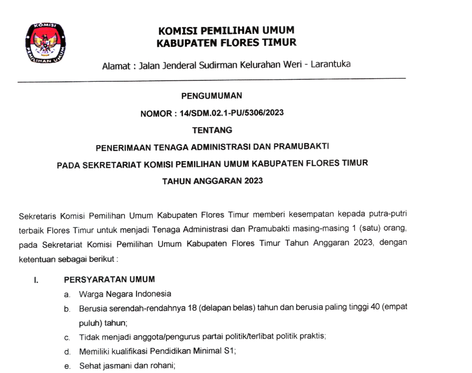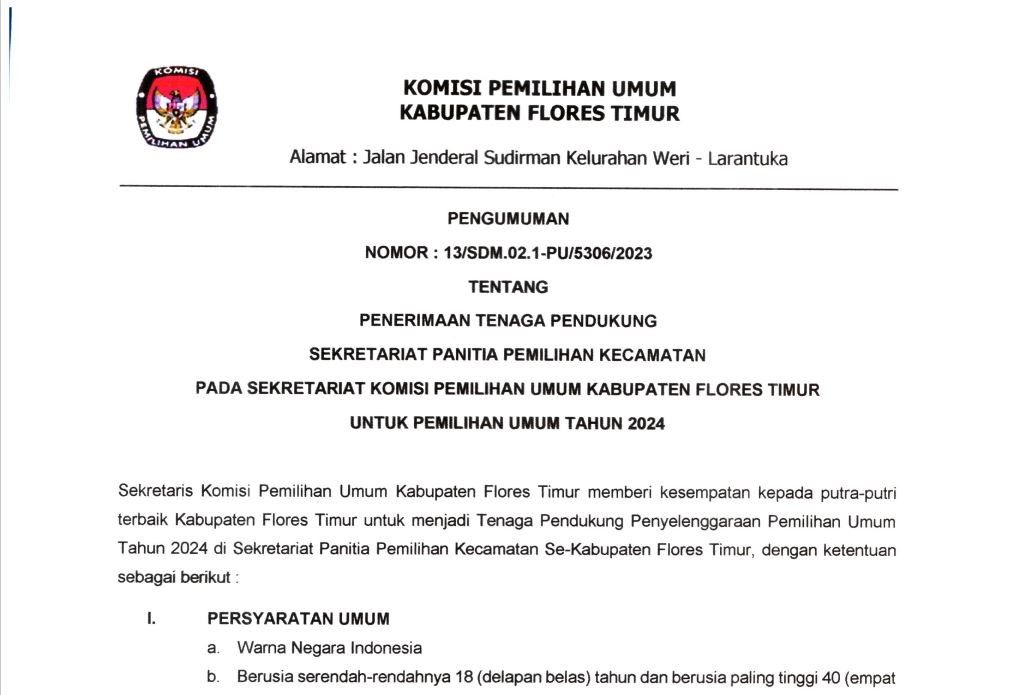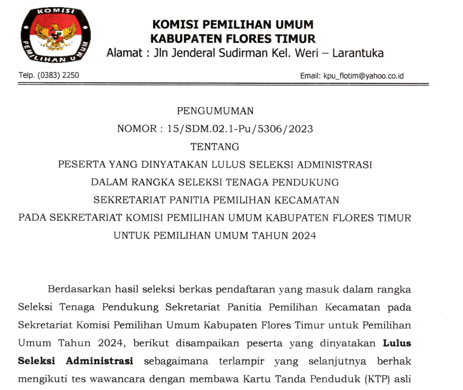 Berdasarkan hasil seleksi berkas pendaftaran yang masuk dalam rangka Seleksi Tenaga Pendukung Sekretariat Panitia Pemilihan Kecamatan pada Sekretariat Komisi Pemilihan Umum Kabupaten Flores Timur untuk Pemilihan Umum Tahun 2024, berikut disampaikan peserta yang dinyatakan Lulus Seleksi Administrasi sebagaimana terlampir yang selanjutnya berhak mengikuti tes wawancara dengan membawa Kartu Tanda Penduduk (KTP) asli, lebih lanjut KLIK DI SINI