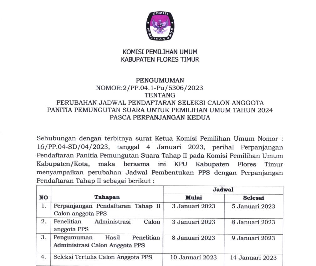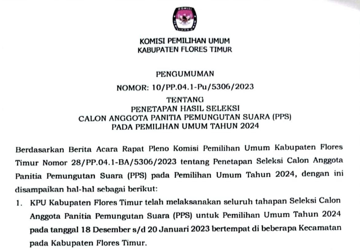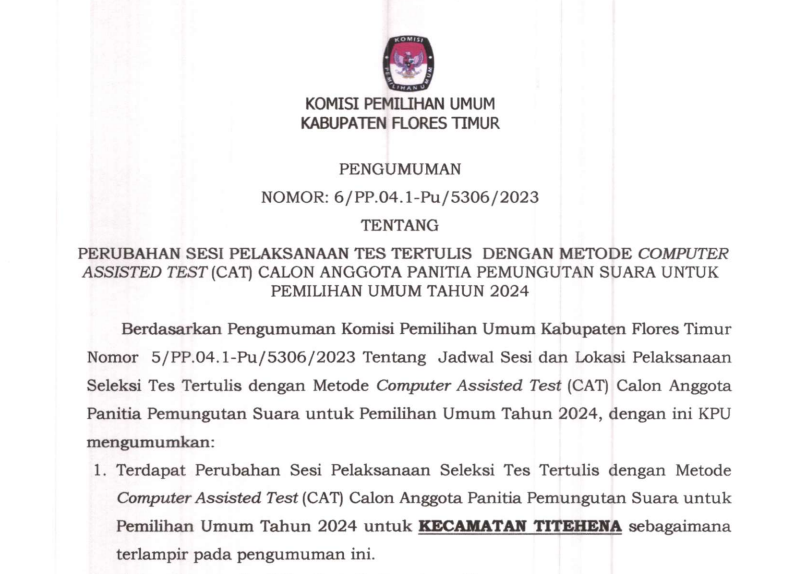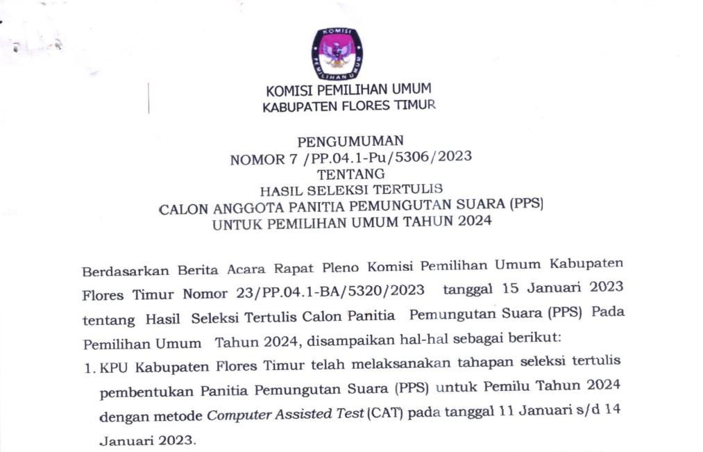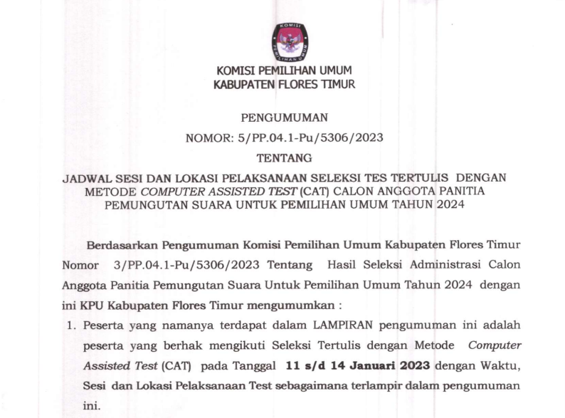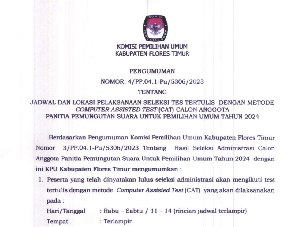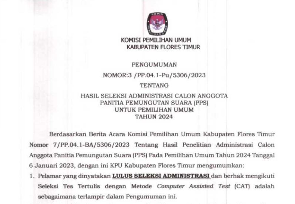 Berdasarkan Pengumuman Komisi Pemilihan Umum Kabupaten Flores Timur Nomor 3/PP.04.1-PU/5306/2023 Tentang Hasil Seleksi Administrasi Calon Anggota Panitia Pemungutan Suara Untuk Pemilihan Umum Tahun 2024, KPU Kabupaten Flores Timur mengumumkan Peserta yang telah dinyatakan lulus seleksi administrasi untuk mengikuti test tertulis dengan metode Computer Assisted Test (CAT) pada waktu dan tempat, sebagaimana terlmpir dalam dokumen pengumuman.