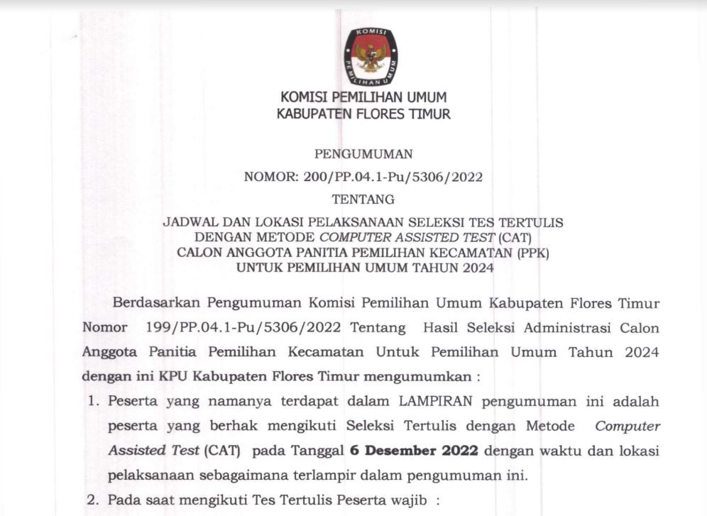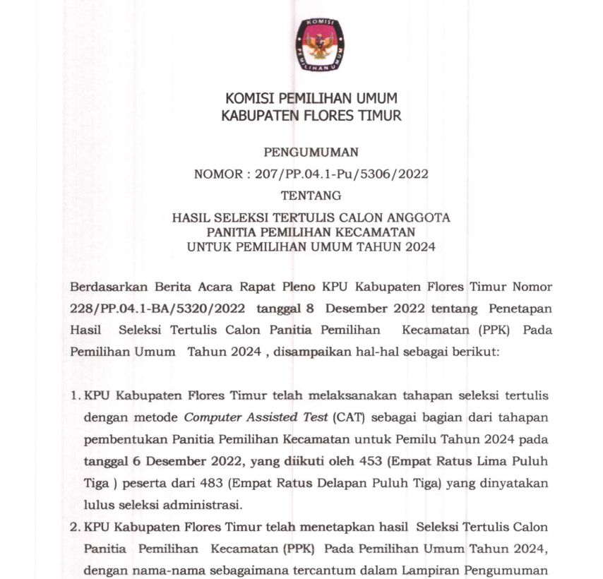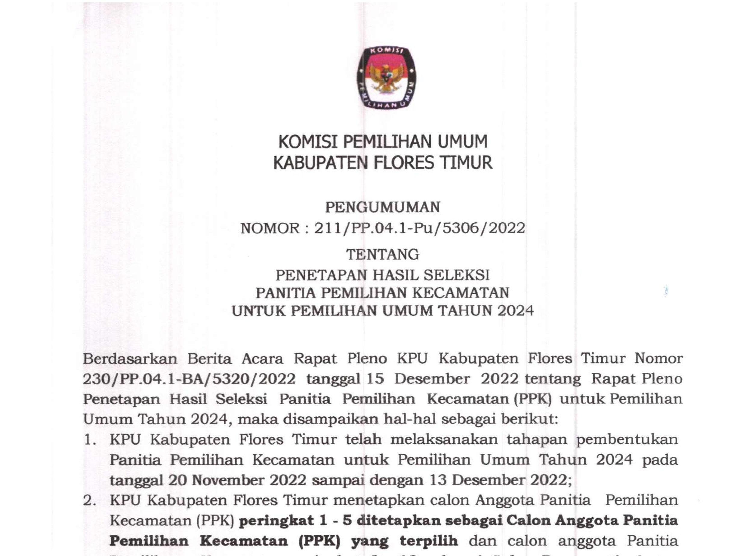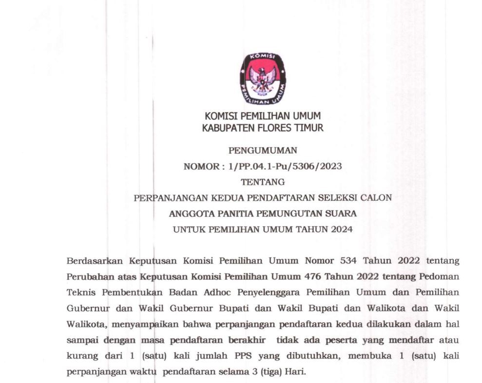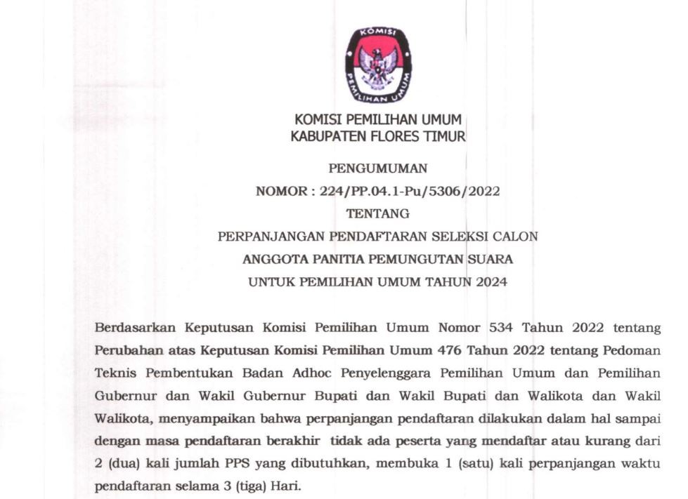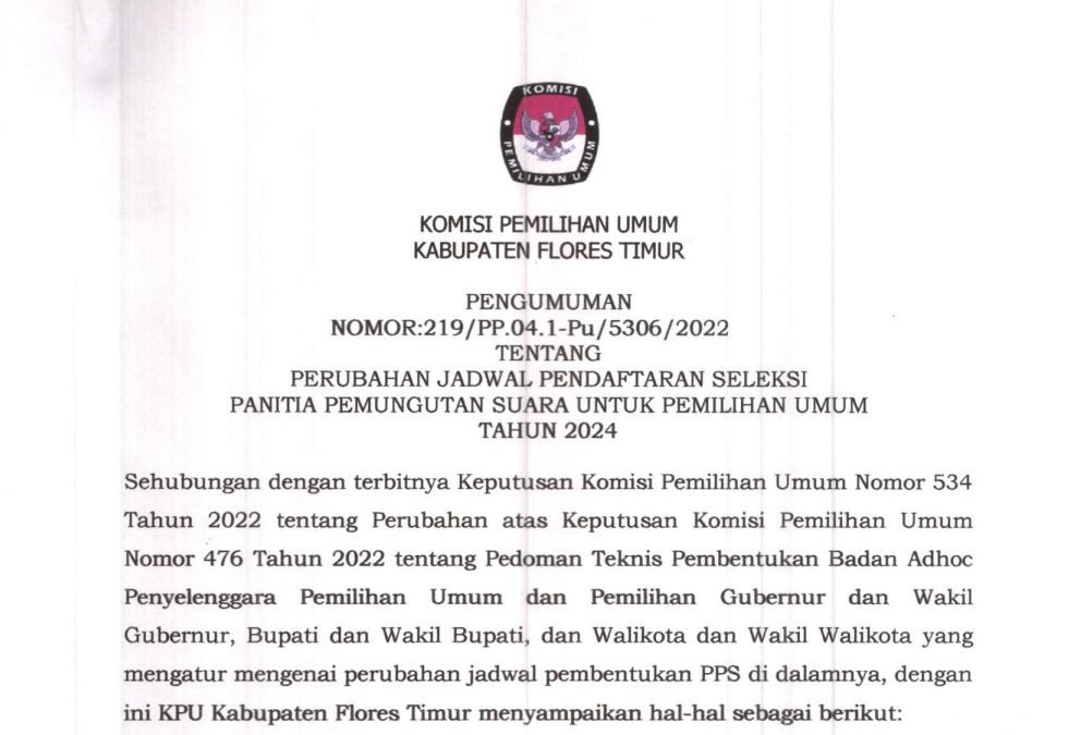 #SahabatPemilih, Sehubungan dengan terbitnya Keputusan Komisi Pemilihan Umum Nomor 534 Tahun 2022 tentang Perubahan atas Keputusan Komisi Pemilihan Umum Nomor 476 Tahun 2022 tentang Pedoman Teknis Pembentukan Badan Adhoc Penyelenggara Pemilihan Umum dan Pemilihan Gubernur dan Wakil Gubernur, Bupati dan Wakil Bupati, dan Walikota dan Wakil Walikota yang mengatur mengenai perubahan jadwal pembentukan PPS di dalamnya, dengan ini KPU Kabupaten Flores Timur menyampaikan hal-hal sebagai berikut: >>> Selengkapnya Unduh Dokumen Pengumuman.