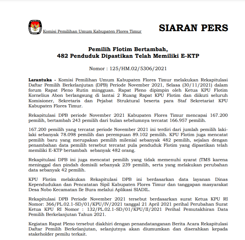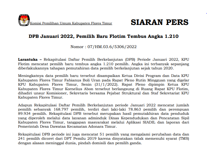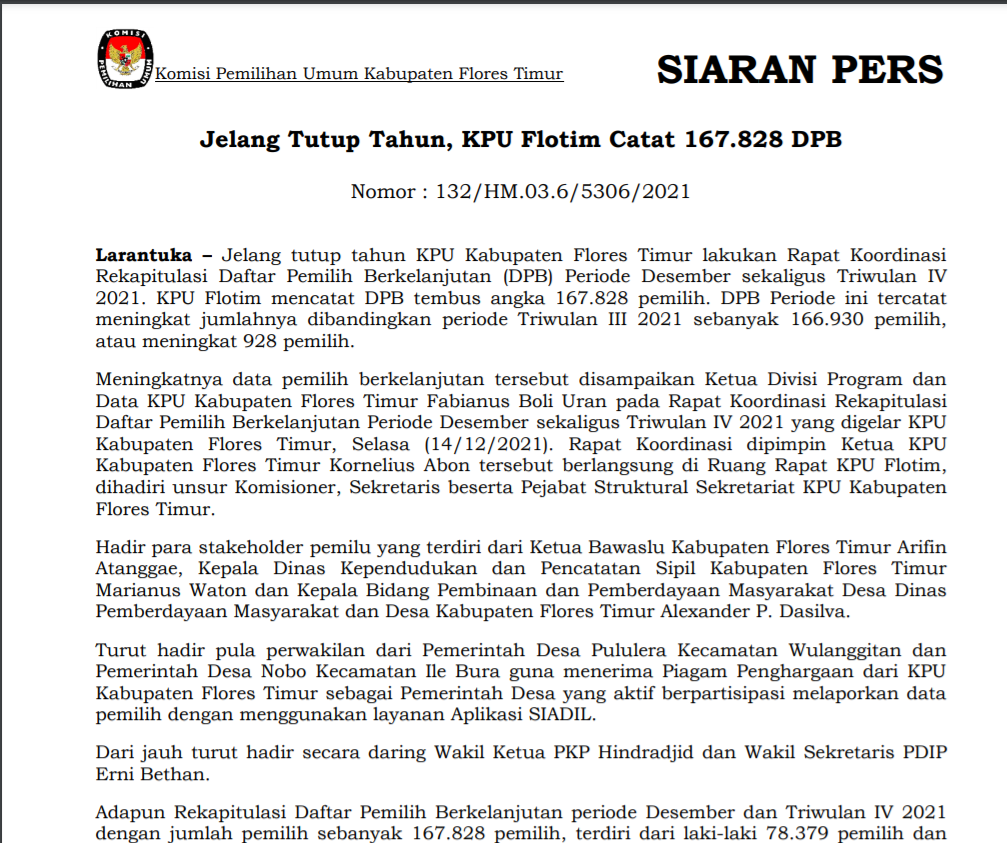 SIARAN PERS: KPU Flotim Catat 167.828 Selasa, 14 Desember 2021 00:00 52 Selengkapnya >>> Unduh File Baca Selengkapnya