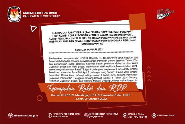 Kesimpulan RDP Komisi II DPR RI dengan Kemendagri, KPU RI, Bawaslu RI dan DKPP Selasa, 25 Januari 2022 00:00 63 #SahabatPemilih, Berikut kesimpulan Rapat Kerja dan Rapat Dengar Pendapat antara Komisi II DPR RI dengan Kemendagri, KPU RI, Bawaslu RI dan DKPP terkait penetapan jadwal Pemilu dan Pemilukada serentak tahun 2024. Silahkan Klik Unduh Baca Selengkapnya