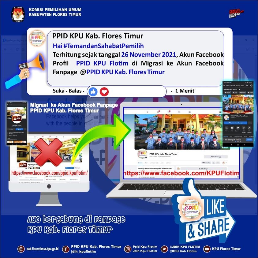 #SahabatPemilih, Pasca workshop Set Up Akun Facebook diselenggarakan KPU RI tanggal 9 s.d 11 November 2021, KPU Flores Timur menindaklanjutinya dengan migrasi Akun Facebook Profile @PPID KPU Flotim ke Akun Facebook Fanpage/Halaman @PPID KPU Kab. Flores Timur. Adapun Akun Media Sosial resmi KPU Kabupaten Flores Timur, digunakan sebagai Media Publikasi dan Sosialisasi Pelaksanaan Kebijakan atas tugas dan fungsi KPU Kabupaten Flores Timur berupa informasi kepemiluan dan kelembagaan.