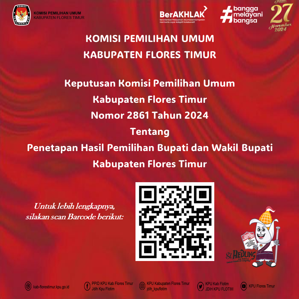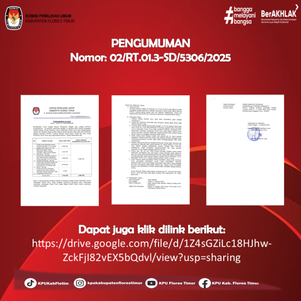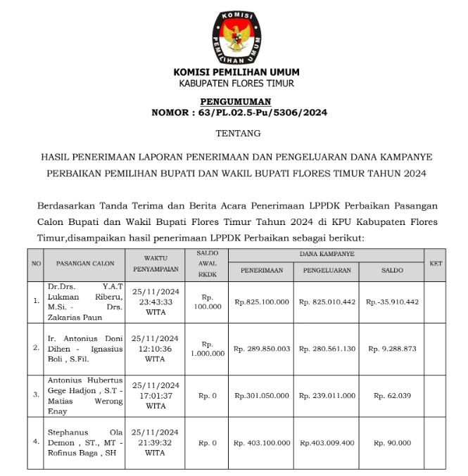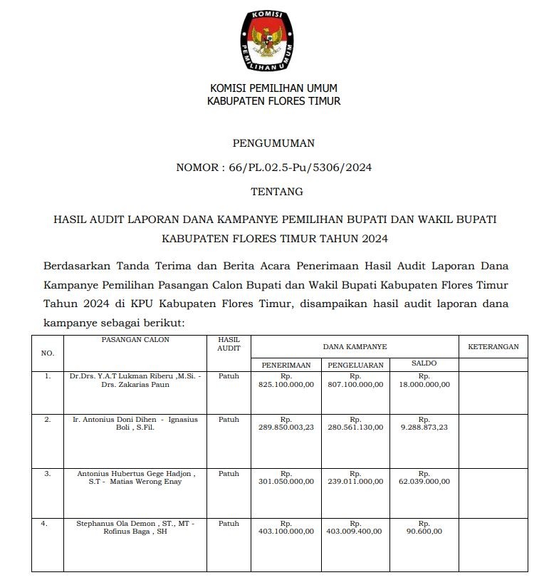 KPU Kabupaten Flores Timur mengumumkan hasil audit Laporan Dana Kampanye Pasangan Calon Bupati dan Wakil Bupati Flores Timur Tahun 2024. Sebagaimana ketentuan,diumumkan ke Publik melalui Laman Resmi KPU Kabupaten dan Papan Pengumuman paling lambat 3 (tiga) Hari setelah menerima hasil audit dari KAP.