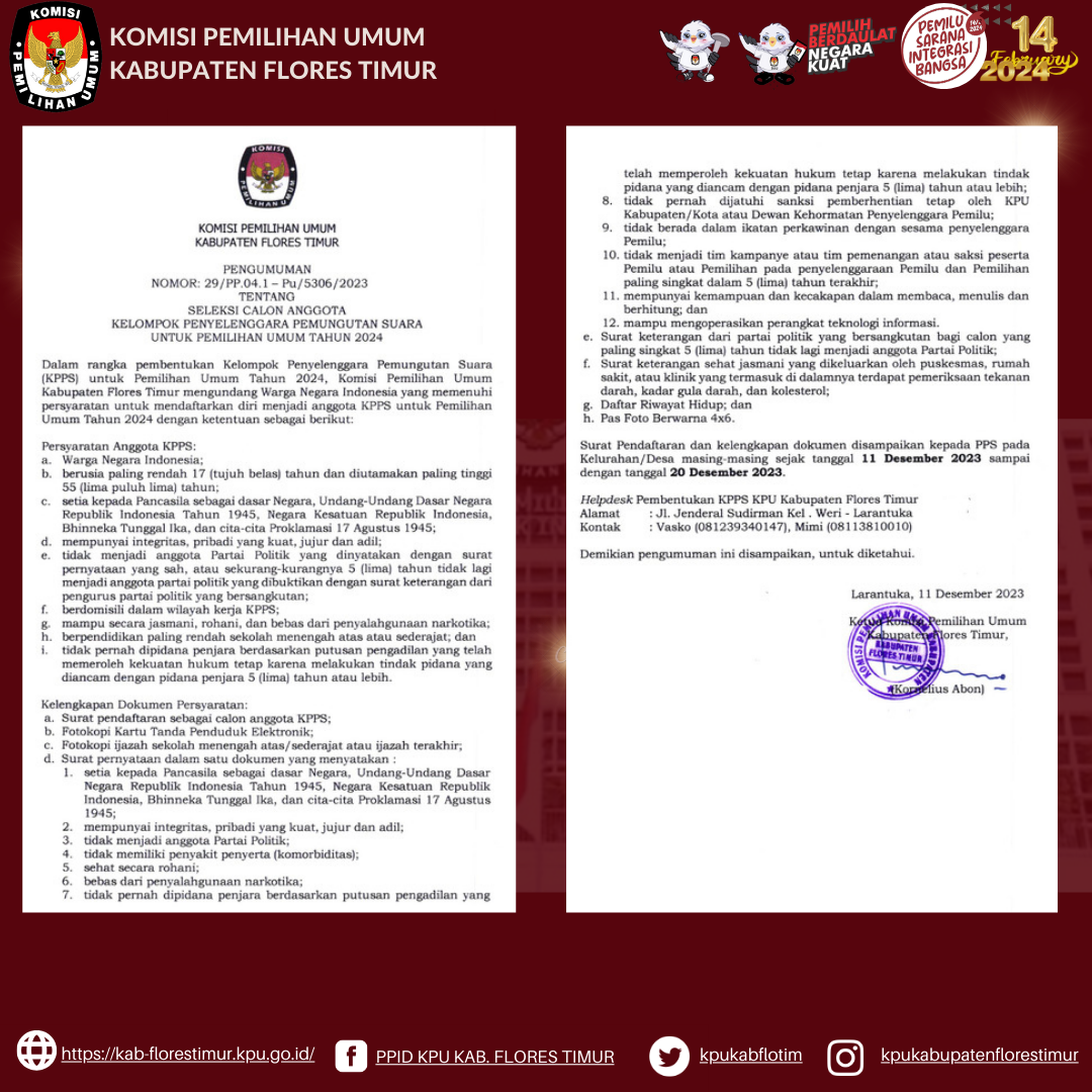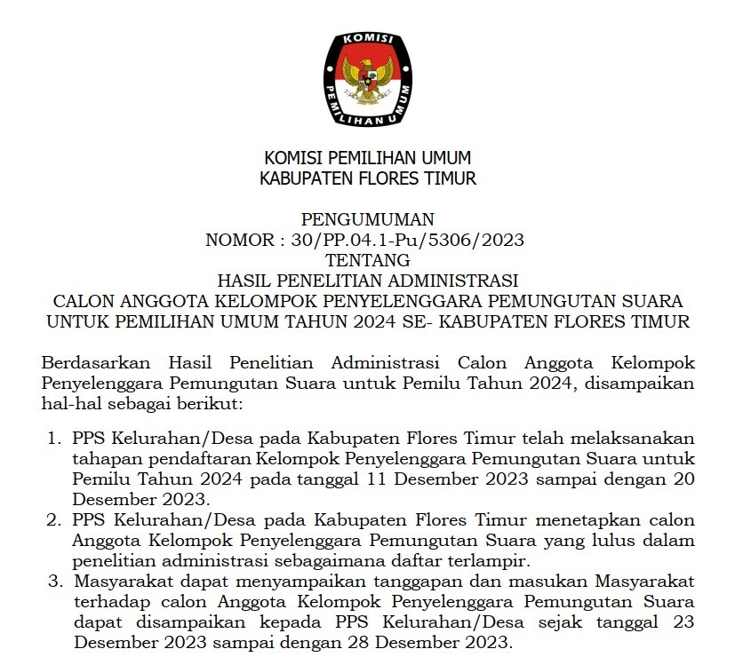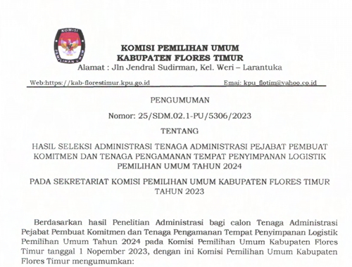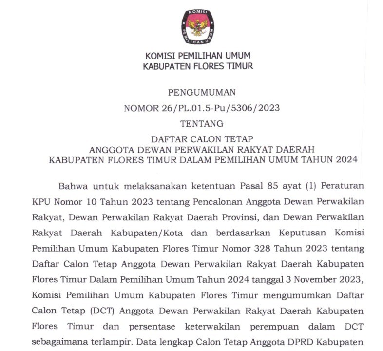 KPU Kab. Flores Timur, Bahwa untuk melaksanakan ketentuan Pasal 85 ayat (1) Peraturan KPU Nomor 10 Tahun 2023 tentang Pencalonan Anggota Dewan Perwakilan Rakyat, Dewan Perwakilan Rakyat Daerah Provinsi, dan Dewan Perwakilan Rakyat Daerah Kabupaten/Kota dan berdasarkan Keputusan Komisi Pemilihan Umum Kabupaten Flores Timur Nomor 328 Tahun 2023 tentang Daftar Calon Tetap Anggota Dewan Perwakilan Rakyat Daerah Kabupaten Flores Timur Dalam Pemilihan Umum Tahun 2024 tanggal 3 Oktober 2023, Komisi Pemilihan Umum Kabupaten Flores Timur mengumumkan Daftar Calon Tetap (DCT) Anggota Dewan Perwakilan Rakyat Daerah Kabupaten Flores Timur dan persentase keterwakilan perempuan dalam DCT sebagaimana terlampir. Lebih Lengkap KLIK DISINI